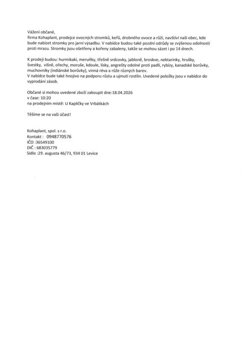 Úvod > Život v obci > Aktuality > Firma Kohaplant bude prodávat ve Vrbátkách ovocné stromky, keře a růže pro jarní výsadbu