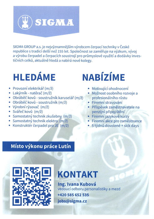 Úvod > Život v obci > Aktuality > Nabídka práce SIGMA GROUP a.s.