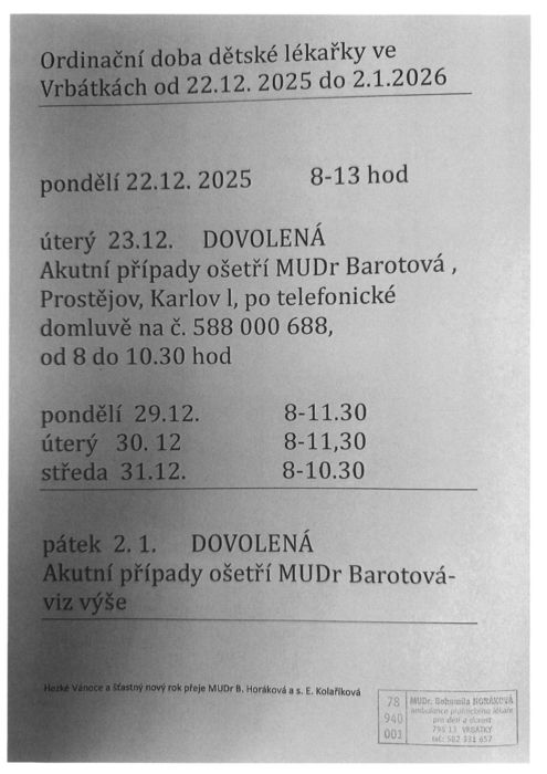 Ordinační doba dětské lékařky MUDr. Horákové od 22.12.2025 do 2.1.2026