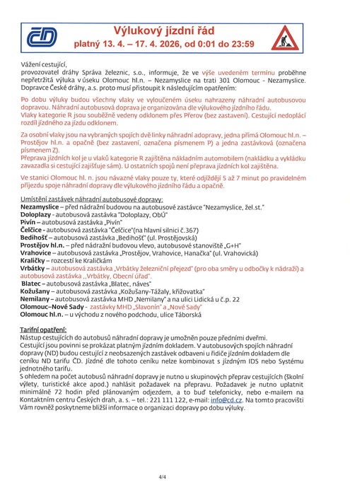 V úterý dne 14.4.2026 z důvodu uzavírky železničního přejezdu od 8:00 hod. do 18:00 hod. nebude obsluhována zastávka náhradní autobusové dopravy "Vrbátky, žel. přejezd".