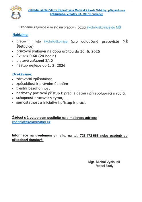 Úvod > Život v obci > Aktuality > ZŠ Vrbátky hledá pro odloučené pracoviště MŠ Štětovice školníka/školnici